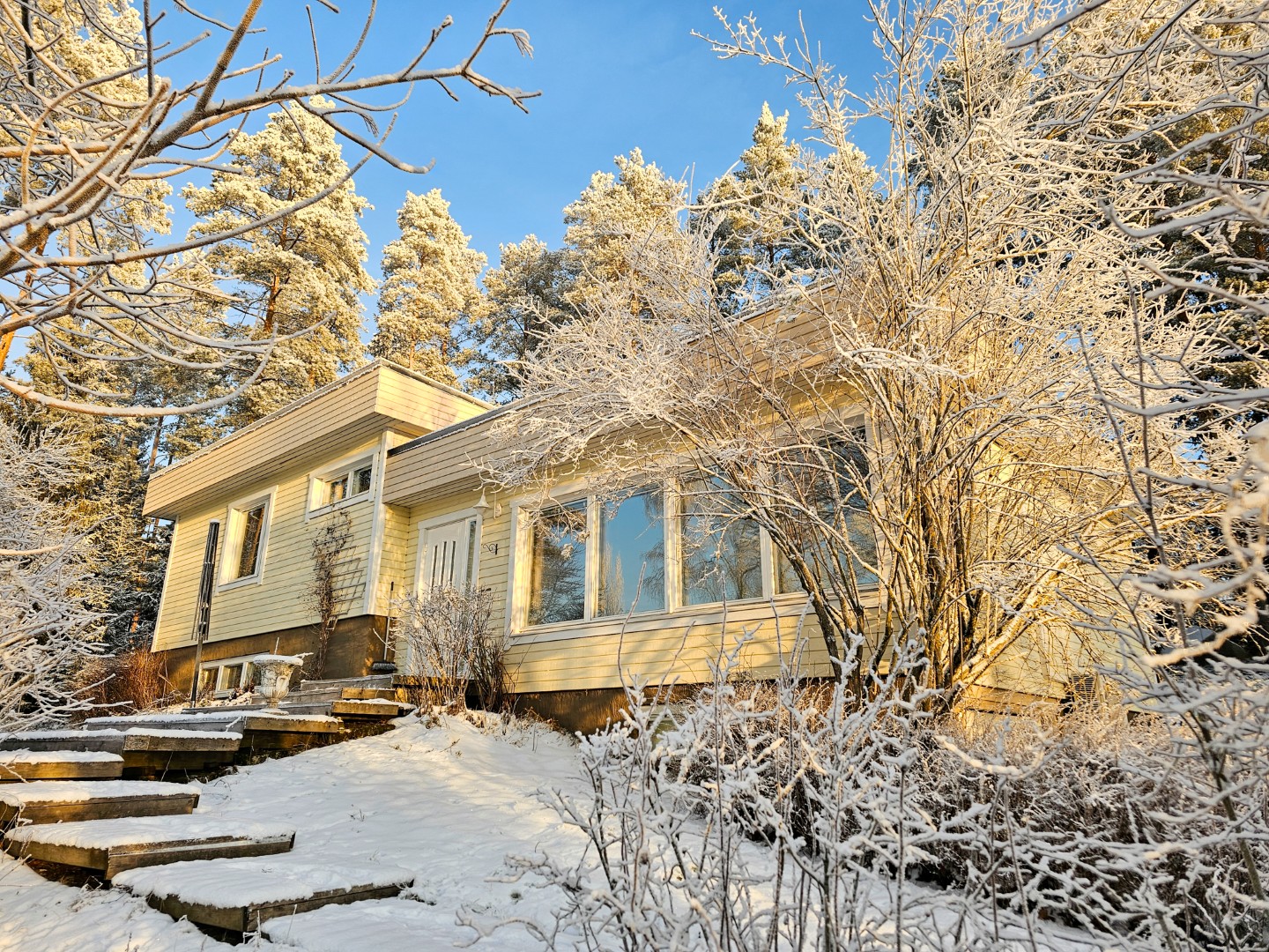 Egnahemshus | 1959 | 5 r, 2 k, wc, 2 bdr, b, | ingl terrass, balkong, källare | Garage/bt, förråd, strandstuga, grilltak | Strandtomt 2397 m2